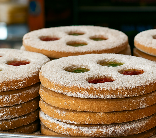 Galletas 4 ojos, suaves y doradas, cubiertas con azúcar pulverizada. Cada una tiene cuatro ventanas rellenas de mermelada frutal que brillan con color. Un bocado dulce, delicado y lleno de encanto artesanal.